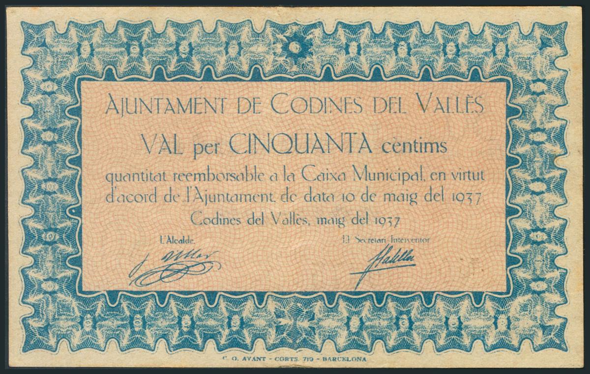 CODINES DEL VALLES (BARCELONA). 50 Céntimos. Mayo de 1937. MBC.