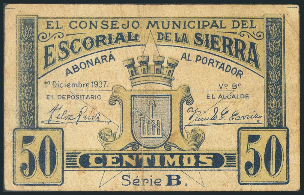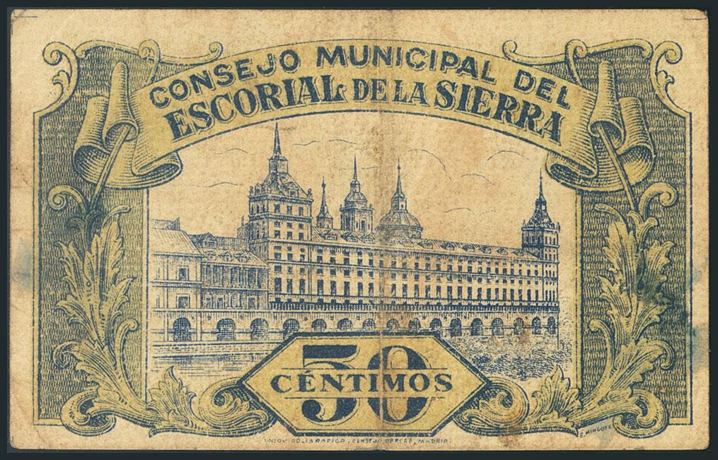 ESCORIAL (MADRID). 50 Céntimos. 1 de Diciembre de 1937. (González: 2325). Raro. BC.