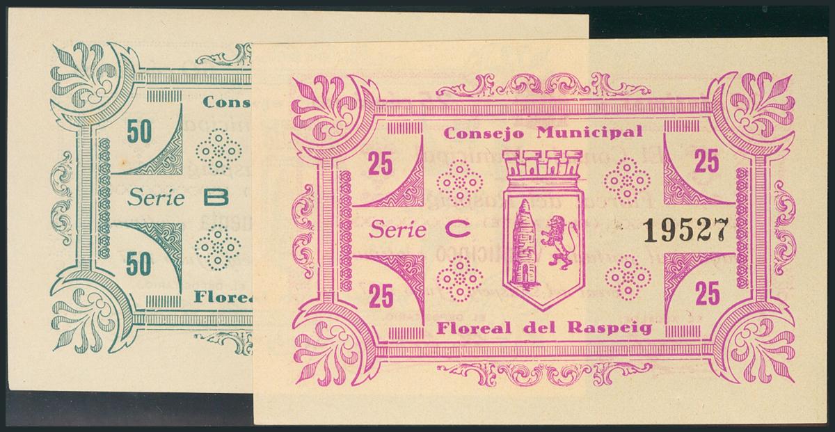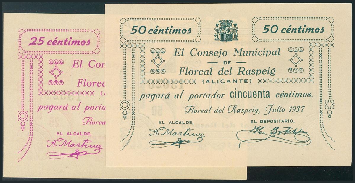 FLOREAL DEL RASPEIG (ALICANTE). 25 Céntimos y 50 Céntimos. Julio de 1937. (González: 2461, 2462). EBC.
