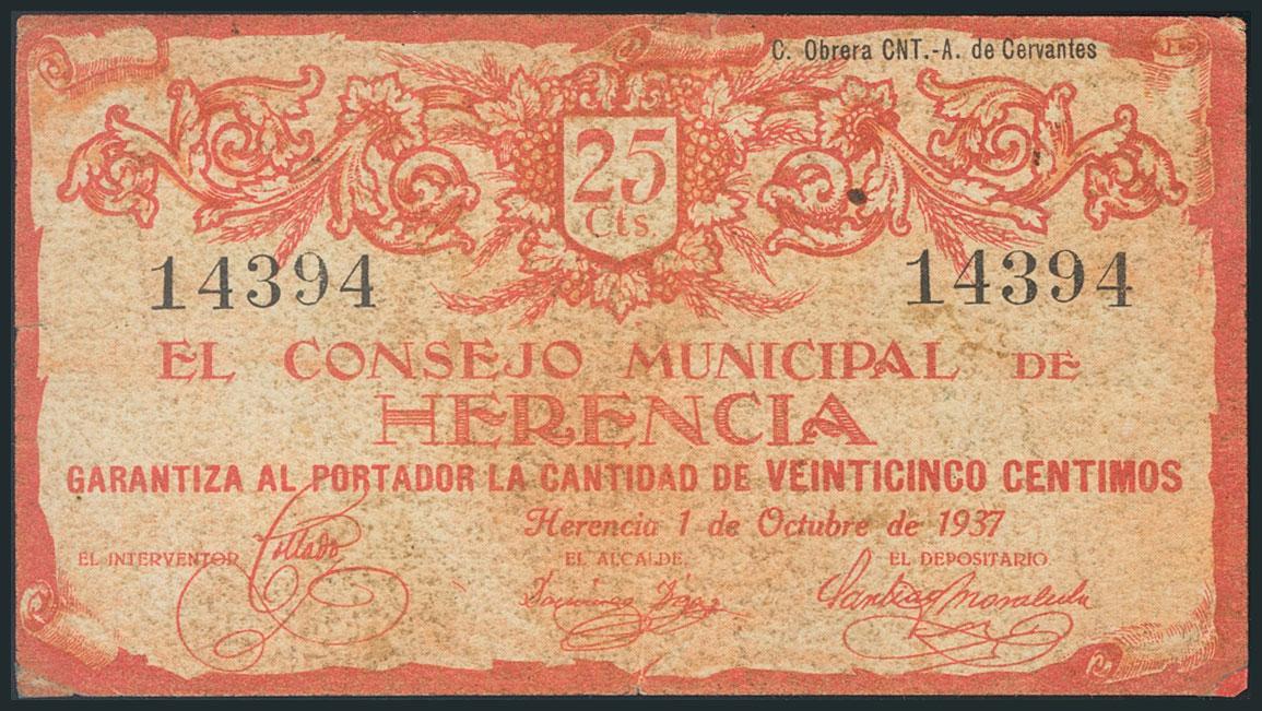 HERENCIA (CIUDAD REAL). 25 Céntimos. Octubre de 1937. (González: 2818). Inusual. BC.