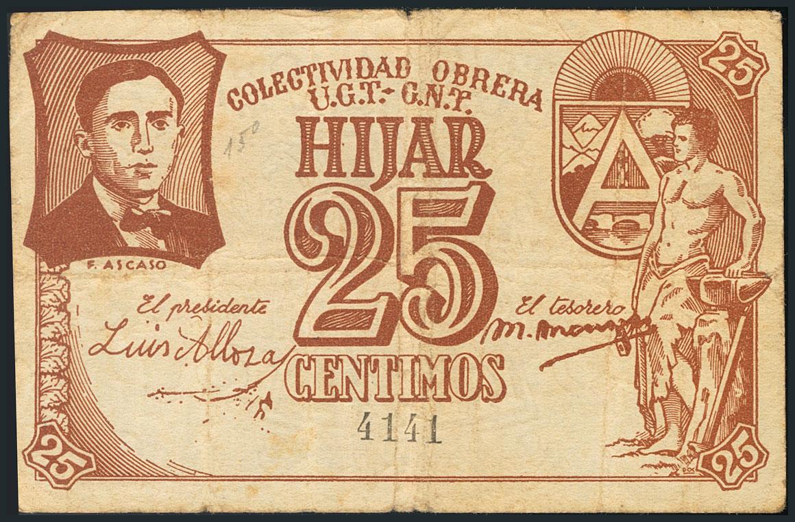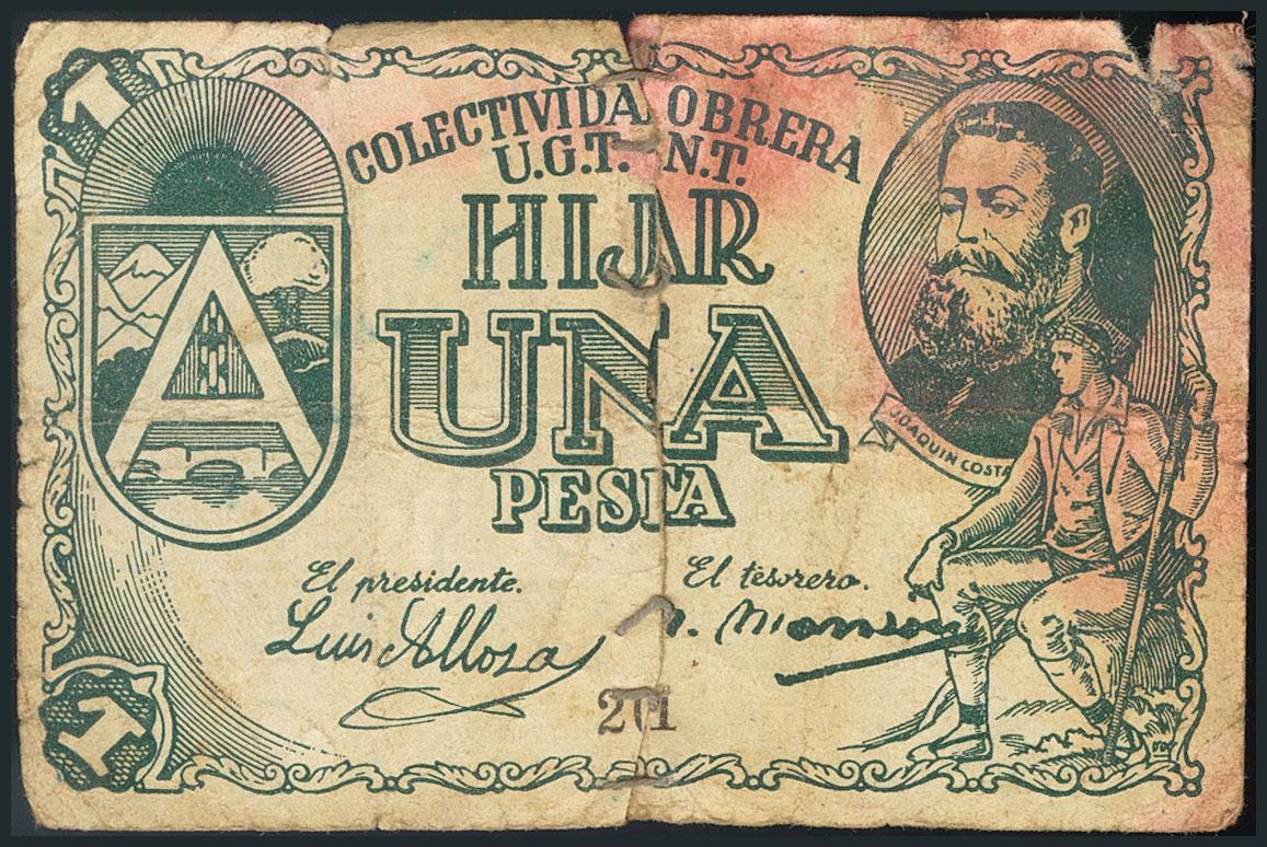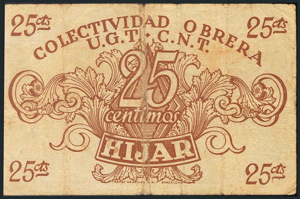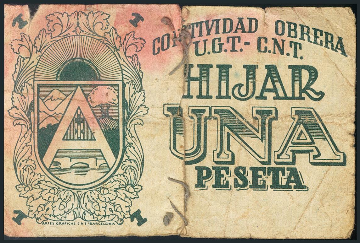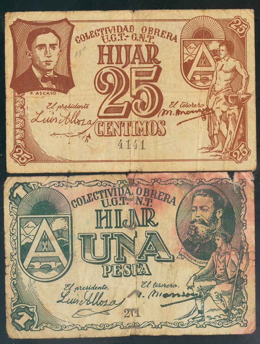 HIJAR (TERUEL). 25 Céntimos y 1 Peseta (cosido con hilo). (1936ca). (González: 2849, 2850). Inusual. BC/RC.