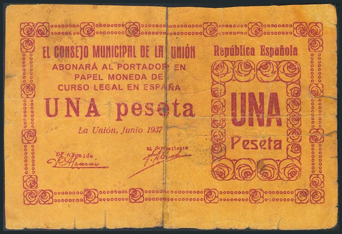 LA UNION (MURCIA). 1 Peseta. Junio de 1937. Papel naranja. (González: 5224). RC-.