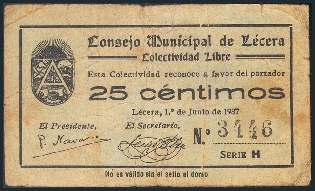 LECERA (ZARAGOZA). 25 Céntimos. 1 de Junio de 1937. (González: 3123). Inusual. BC.