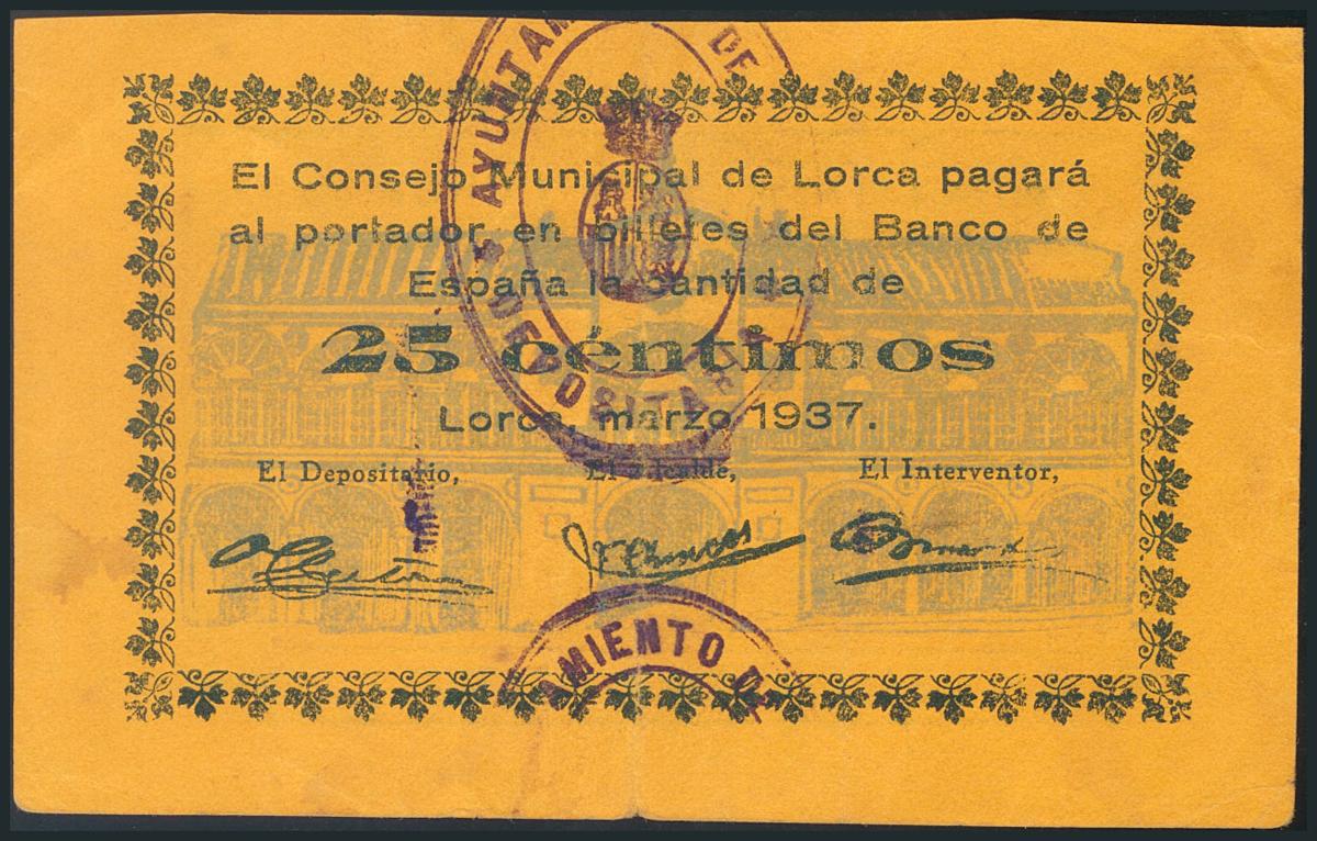 LORCA (MURCIA). 25 Céntimos. Marzo de 1937. (González: 3229). MBC.