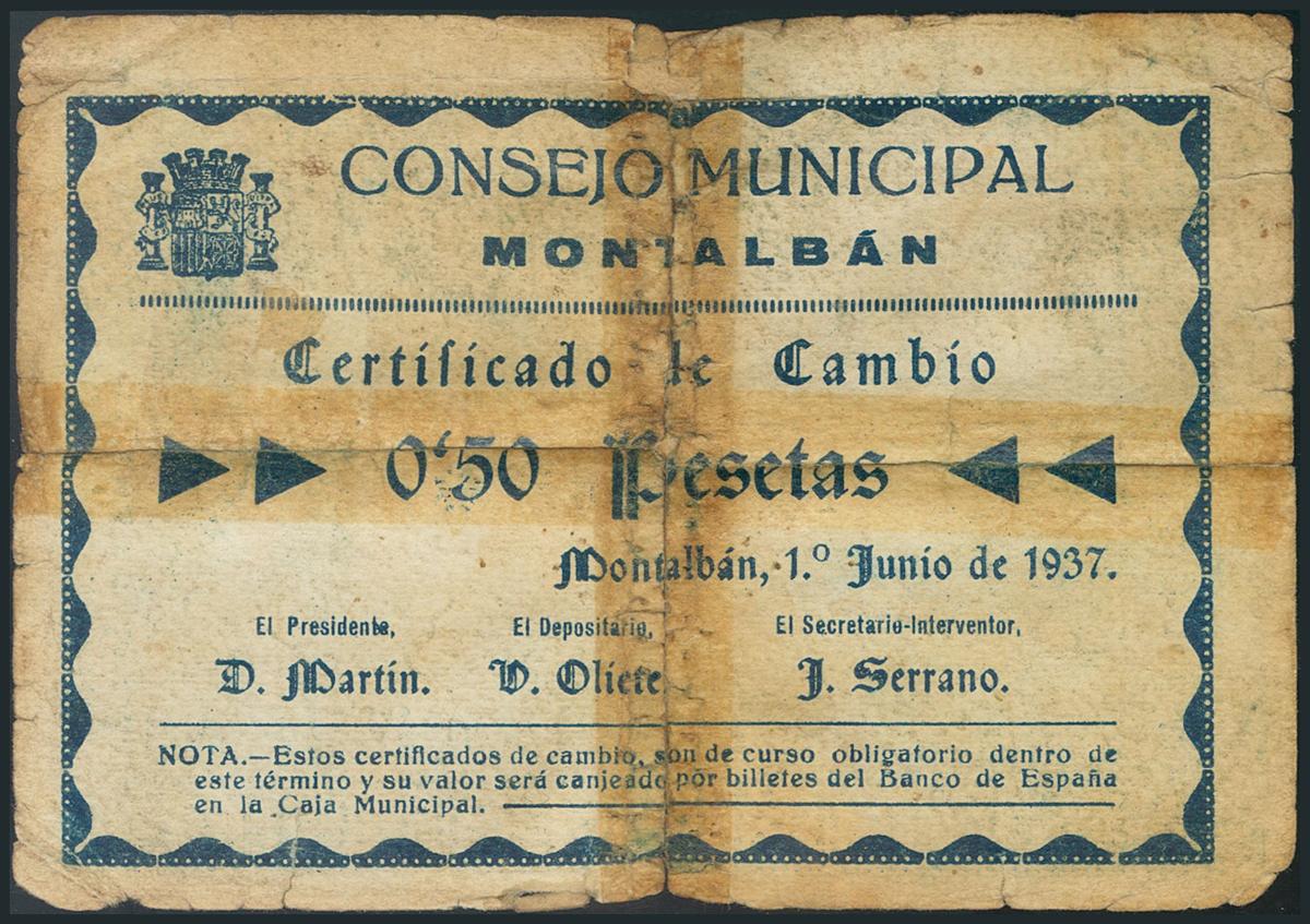 MONTALBAN (TERUEL). 50 Céntimos. 1 de Junio de 1937. (González: 3618). Raro. RC.