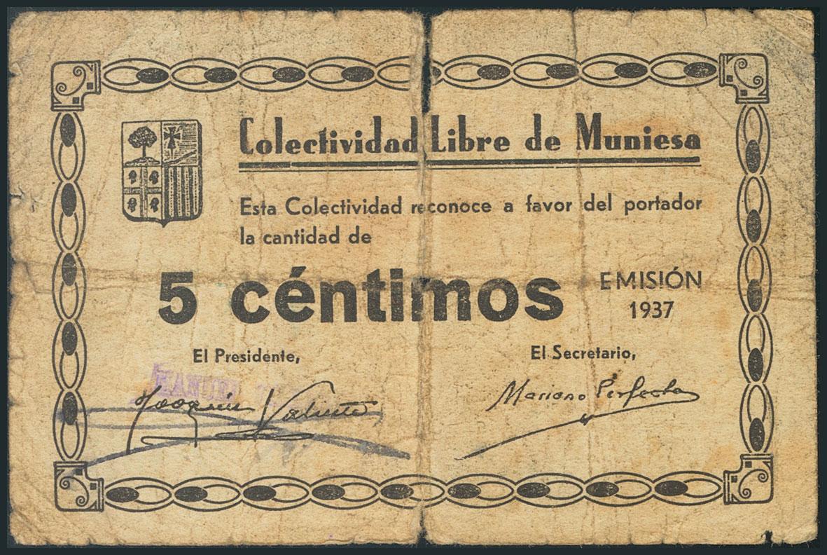 MUNIESA (TERUEL). 5 Céntimos. 1937. (González: 3761). Raro. RC.