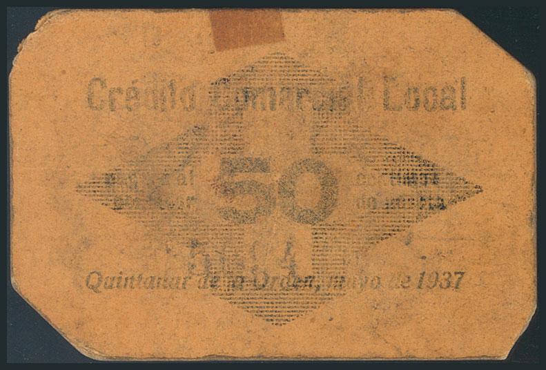 QUINTANAR DE LA ORDEN (TOLEDO). 50 Céntimos. Mayo de 1937. (González: 4448). Muy raro. BC.