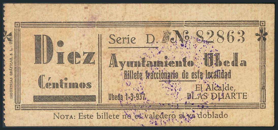UBEDA (JAEN). 10 Céntimos. 1 de Marzo de 1937. Tipo anverso fondo blanco. (González: 5197). Inusual. BC.