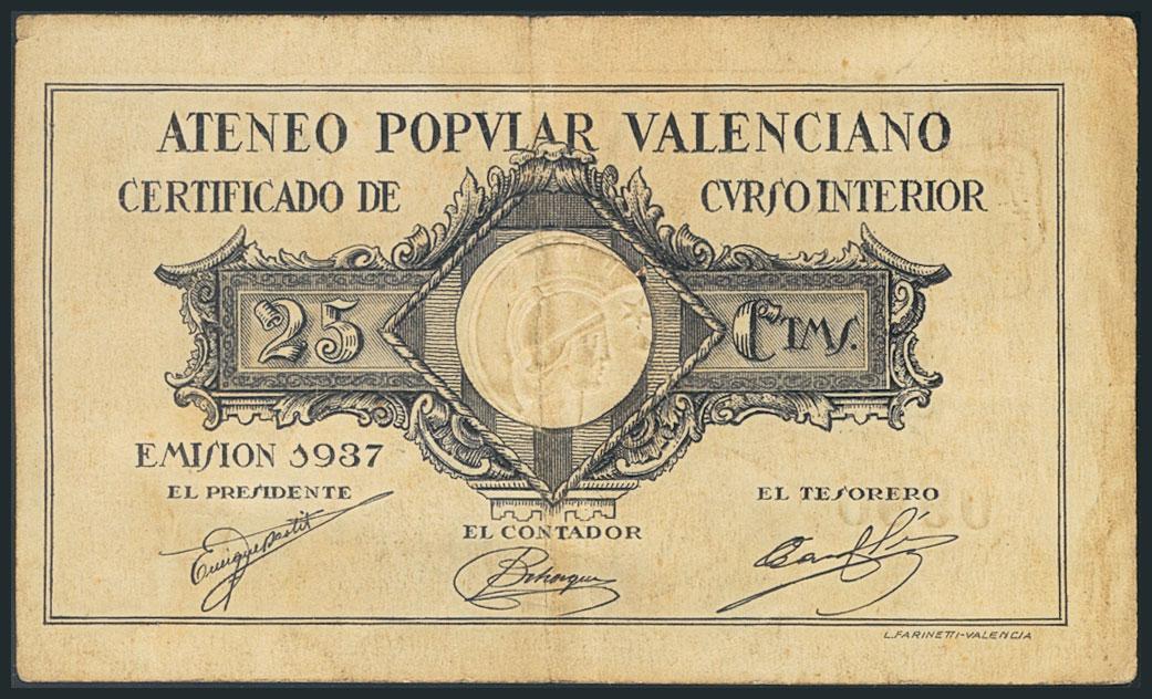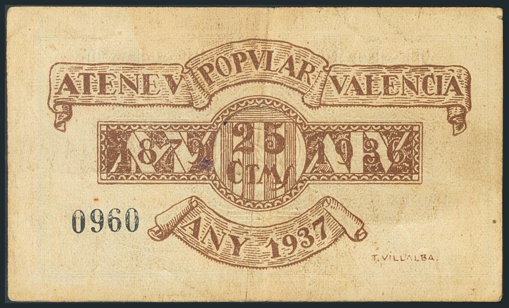 VALENCIA. 25 Céntimos. 1937. Anverso en negro y reverso en marrón. (González: 5301). Raro. BC.