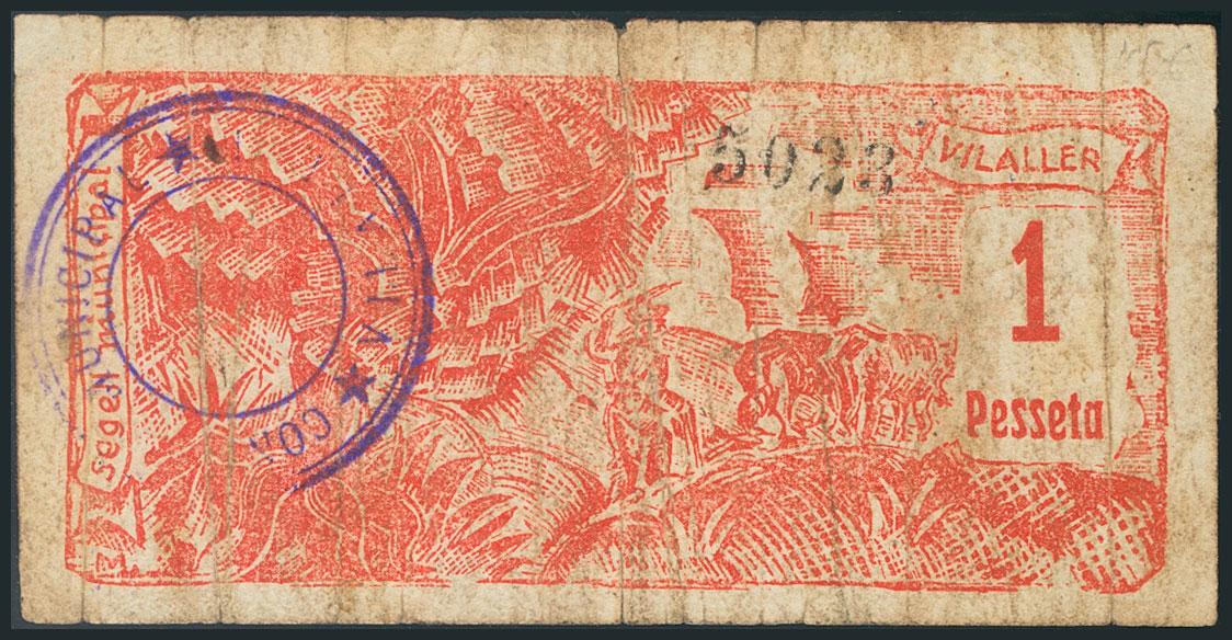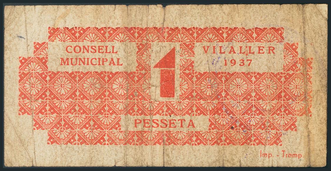VILALLER (LERIDA). 1 Peseta. 1937. Raro. RC.