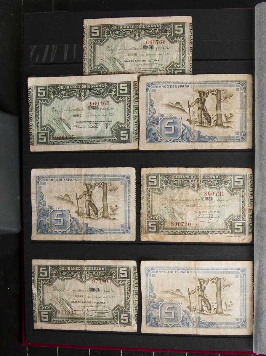 Precioso conjunto de billetes del Banco de España emitidos en Bilbao en 1937, diversos valores y la mayoría calidades BC. A EXAMINAR.