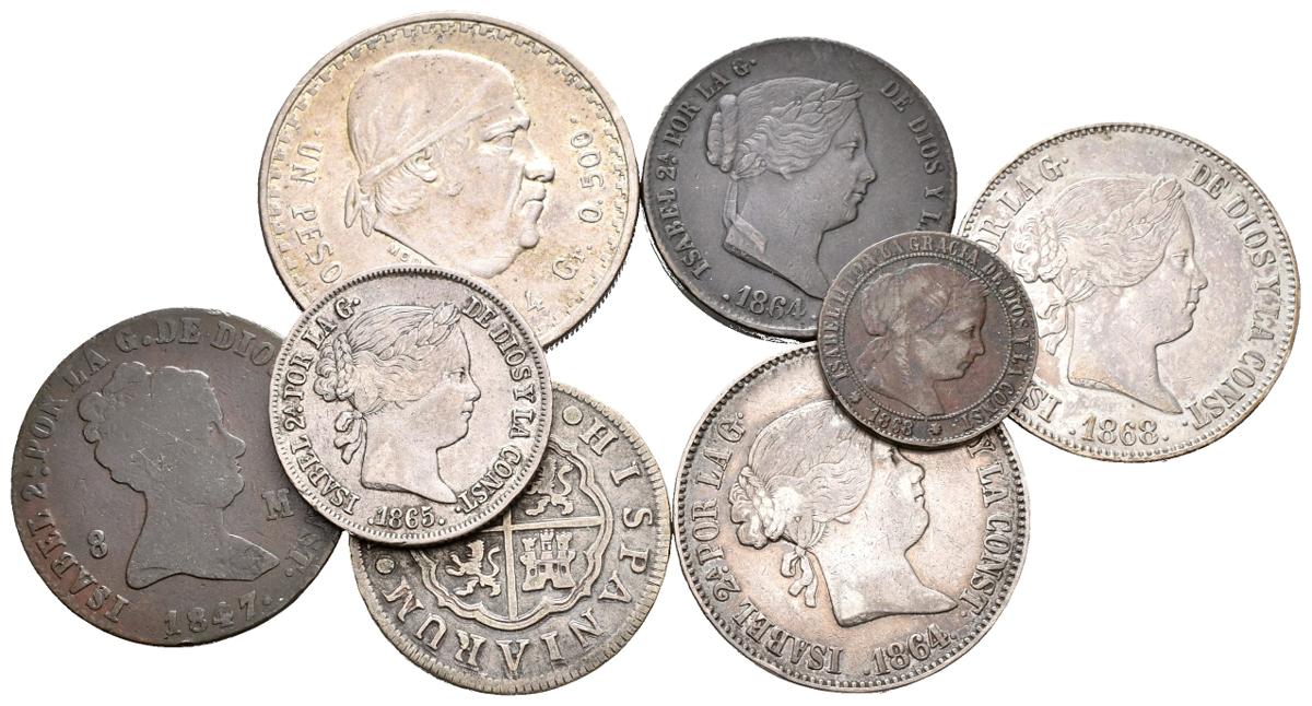 MONARQUIA ESPAÑOLA. Lote compuesto por 6 monedas de Isabel II, 1 de Carlos III y 1 de México. Ar y Ae. A EXAMINAR.