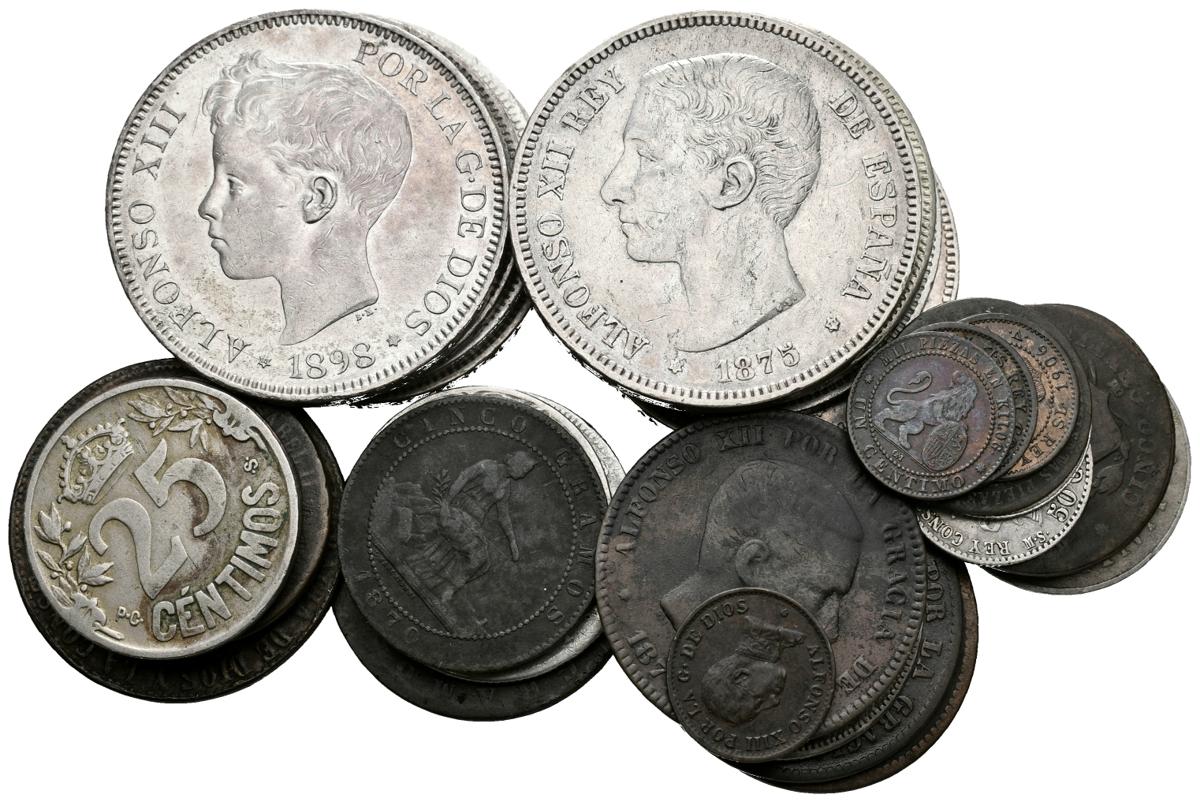 ISABEL II Y CENTENARIO DE LA PESETA. Lote compuesto por 36 monedas, conteniendo: Isabel II. 2 1/2 Céntimos de Escudo. 1868. Jubia y Segovia, 5 Céntimos de Escudo. 1867. Barcelona; Gobierno Provisional. 1 Céntimo. 1870 OM, 2 Céntimos. 1870 OM, 5 Céntimos. 1870 OM (2), 10 Céntimos. 1870 OM, 2 Pesetas. 1870 *74 y 73; Alfonso XII. 5 Céntimos. 1877 OM, 1878 OM y 1879 OM, 10 Céntimos. 1878 OM (2) y 1879 OM, 50 Céntimos. 1880 MSM, 2 Pesetas. 1881 MSM, 5 Pesetas. 1875 *18-75. DEM (2), 1876 *18-76. DEM. 1883 *18-83. MSM y 1885 *18-87. MSM (Falsa); Alfonso XIII. 1 Céntimo. 1906 *6 SLV (2), 1912 *2 PGV, 2 Céntimos. 1912 *12 PGV, 25 Céntimos. 1925 PGS (2), 1927 PGS, 50 Céntimos. 1926 PGS, 5 Pesetas 1888 *18-88 MPM, 1897 *18-97 SGV (2) y 1898 *18-98 SGV. Ae-Ar. A EXAMINAR.