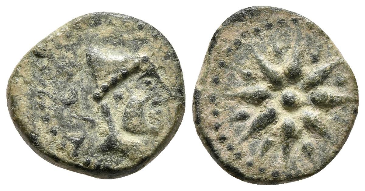 MALACA. 1/4 Calco. 200-20 a.C. Málaga. A/ Cabeza con gorro egipcio a izquierda. R/ Estrella de ocho radios. FAB-1723. Ae. 2,41g. MBC-.