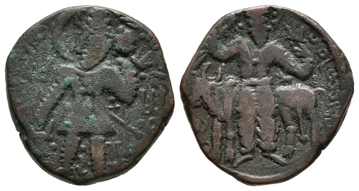 IMPERIO KUSHAN. Vasudeva I. Dracma. 191-230 d.C. A/ Vasudeva en pie de frente mirando a izquierda sacrificando sobre altar y sosteniendo tridente. R/ Siva en pie sosteniendo su diadema y levantando la mano izquierda, detrás toro Nandi a izquierda. MK 1025 (Vasudeva III). Ae. 3,53g. MBC.