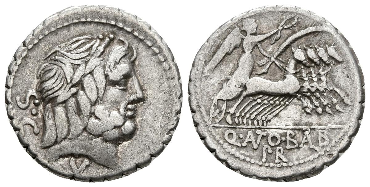 Q. ANTONIUS BALBUS. Denario. 83-82 a.C. Roma. A/ Busto laureado de Júpiter a derecha, detrás S·C, bajo él X. R/ Victoria a las riendas de una cuádriga a derecha, esta porta palma y corona, en exergo Q·ANTO·BALB-PR. Craw 364.1d. Ar. 3,80g. MBC-.