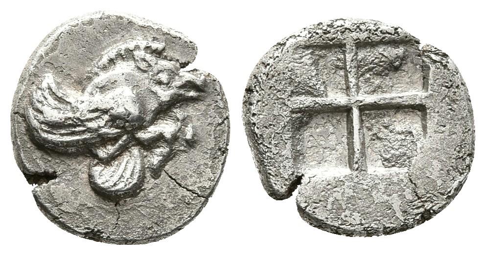 IONIA. KLAZOMENAI. Dióbolo. 480-400 a.C. A/ Parte delantera de jabalí alado volando a derecha. R/ Cuatripartito incuso. SNG München 451; SNG Kayhan 334; SNG Copenhagen 6; BMC 3; SNG Lockett 2788; SNG von Aulock 1981. Ar. 1,04g. Grieta. MBC.