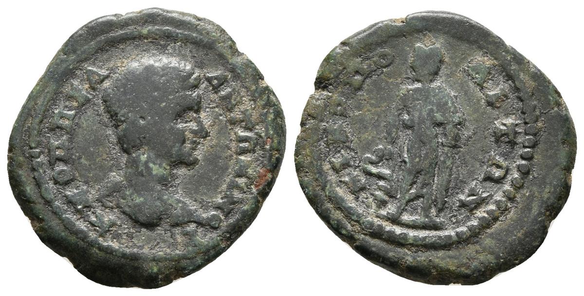 DIADUMENIANO. Ae18. 217-218 d.C. Nicopolis (Moesia Inferior). A/ Busto drapeado con coraza a derecha. R/ Aesculapius estante a izquierda. AMNG 1875. Ae. 3,24g. MBC-. Escasa.