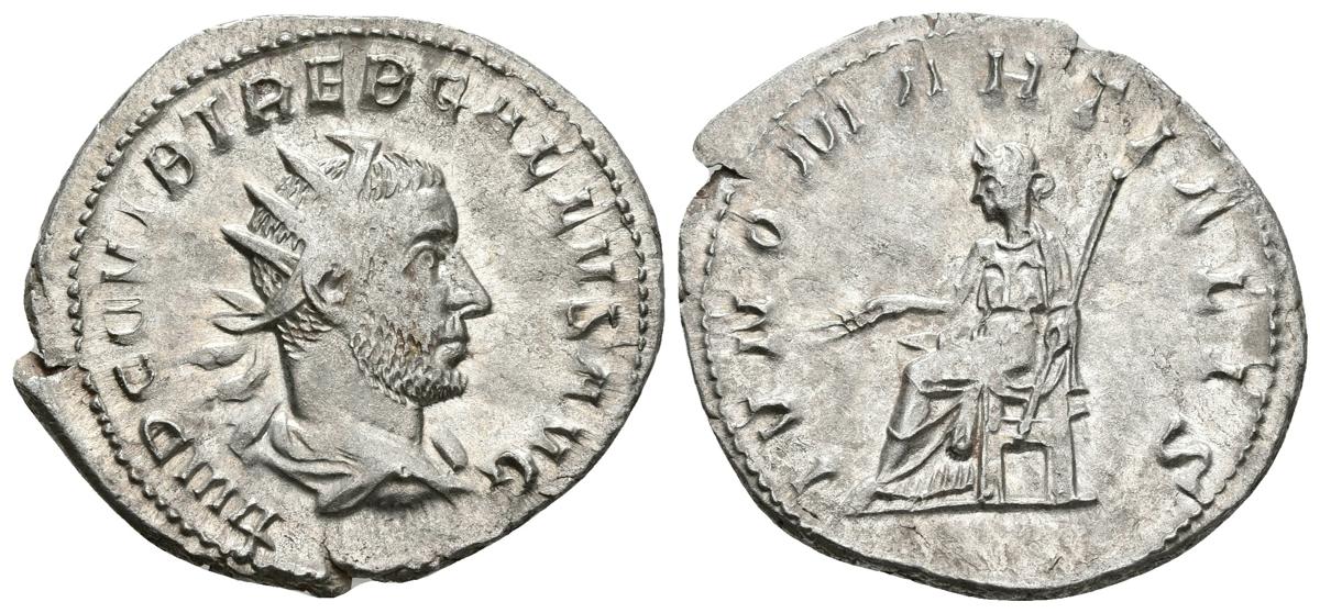 TREBONIANO GALO. Antoniniano. 251-253 d.C. Roma. A/ Busto radiado y drapeado con coraza a derecha. IMP C C VIB TREB GALLVS AVG. R/ Juno sedente a izquierda portando espigas y cetro. IVNO MARTIALIS. RIC 69 (Mediolanum). Ar. 3,42g. MBC+.
