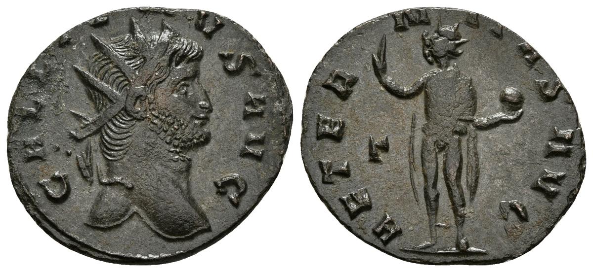 GALIENO. Antoniniano. 260-268 d.C. Roma. A/ Busto radiado a derecha. GALLIENVS AVG. R/ Sol estante a izquierda con mano levantada y portando globo, en campo r. AETERNITAS AVG. RIC 160; RSC 38. Ae. 3,06g. EBC-/MBC.
