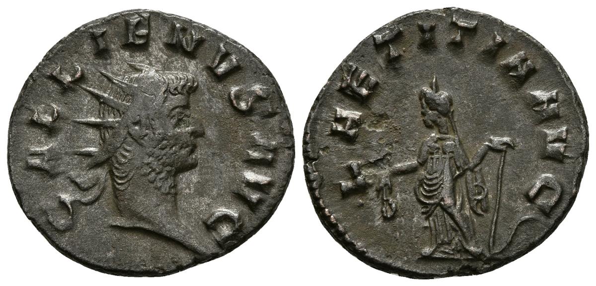 GALIENO. Antoniniano. 263d.C. Mediolanum. A/ Busto radiado a derecha. GALLIENVS AVG. R/ Laetitia estante a izquierda portando corona de laurel y antorcha. LAETITIA AVG. RIC 489; Cohen 423. Ae. 3,15g. MBC+.