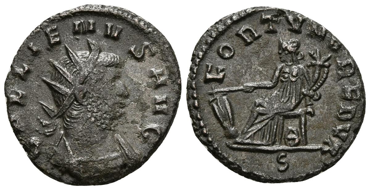 GALIENO. Antoniniano. 264-265 d.C. Mediolanum. A/ Busto radiado y con coraza a derecha. GALLIENVS AVG. R/ Fortuna sedante a izquieda portando cornucopia y cetro, delante timón y bajo el trono rueda. FORTVNA REDVX, en exergo S. RIC 484. Ae. 3,37g. MBC+.