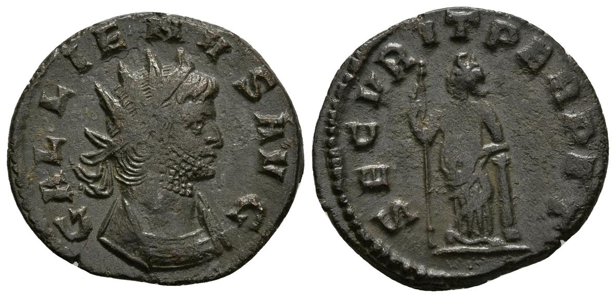 GALIENO. Antoniniano. 265-267 d.C. Roma. A/ Busto radiado a derecha. GALLIENVS AVG. R/ Securitas estante a izquierda portando cetro largo y reposando en columna. SECVRIT PERPET. RIC V 516. Ae. 3,01g. MBC-.