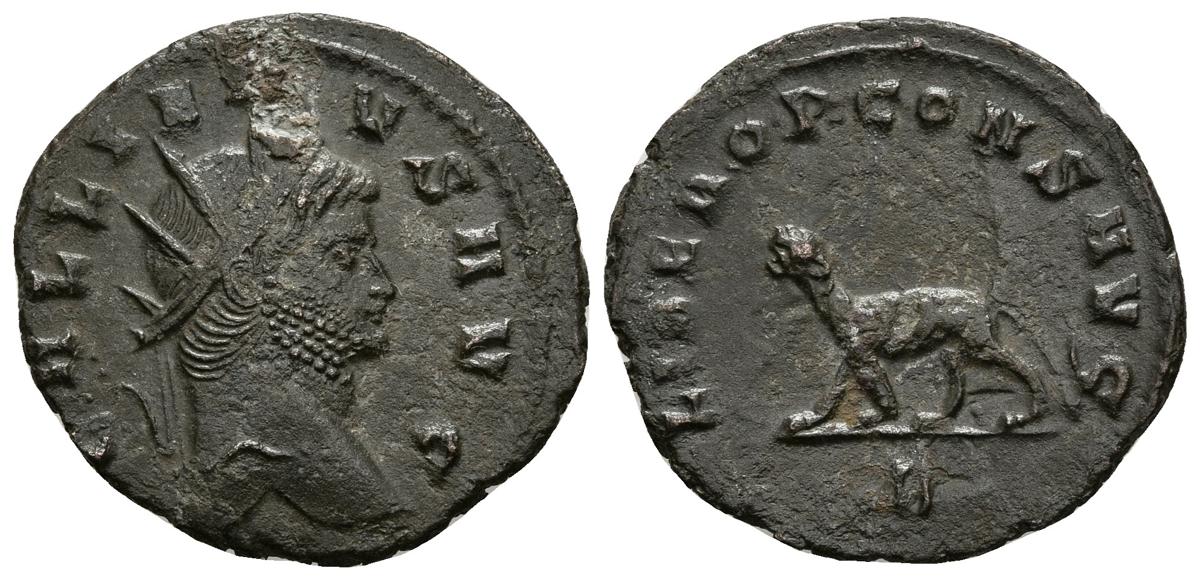 GALIENO. Antoniniano. 267-268 d.C. Roma. A/ Busto radiado a derecha. GALLIENVS AVG. R/ Pantera a izquierda. LIBERO P CONS AVG, en exergo B. RIC 230. Ae. 2,86g. MBC-.