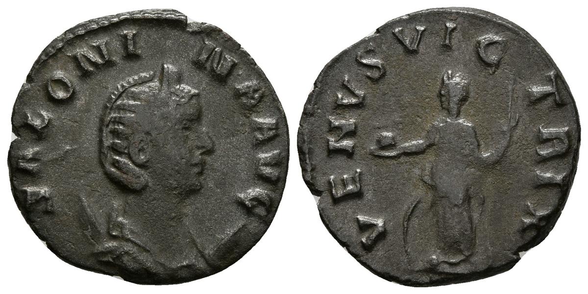 SALONINA. Antoniniano. 264-265 d.C. Roma. A/ Busto radiado y drapeado sobre creciente a derecha. SALONINA AVG. R/ Venus estante a izquierda portando casco y lanza, a sus pies escudo. VENVS VICTRIX. RIC 31. Ae. 2,62g. MBC-.