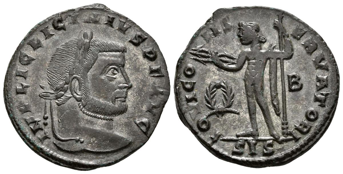 LICINIO I. Follis. 312 d.C. Siscia. A/ Busto laureado a derecha. IMP LIC LICINIVS P F AVG. R/ Júpiter a izquierda sosteniendo rayos sobre globo y cetro, a la izquierda corona y a la derecha B. IOVI CONSERVATORI, en exergo SIS. RIC 8. Ae. 5.20g. MBC+.