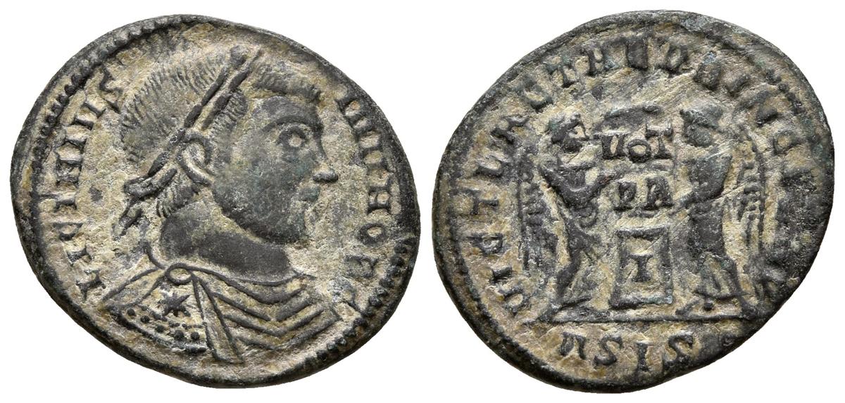 LICINIO II. Follis. 317-324 d.C. Siscia. A/ Busto laureado y drapeado con coraza a derecha. LICINIVS IVN NOB C. R/ Dos victorias sujetando escudo con inscripción VOT-PR debajo altar con letra I. VICTORIAE LAETAE PRINC PERP, en exergo ASIS·. RIC 88. Ae. 2,81g. MBC+.
