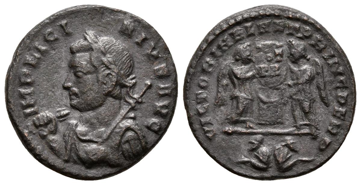 LICINIO I. Follis. 319-320 d.C. Lugdunum. A/ Busto laureado con coraza a izquierda portando mappa y cetro. IMP LICINIVS AVG. R/ Dos victorias sujetando escudo situado sobre altar con inscripción VOT-TR. VICTORIAE LAETAE PRINC PERP, en exergo dos cautivos. RIC No cita. Ae. 3,28g. MBC. Rara.