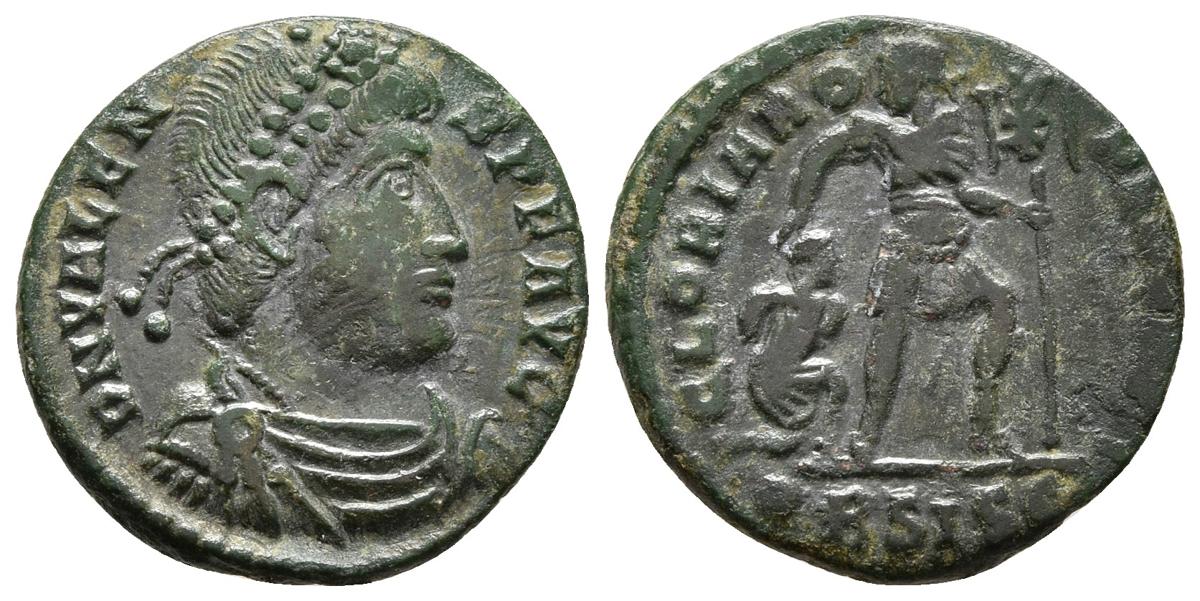 VALENS. Follis. 364-378 d.C. Siscia. A/ Busto con diadema, drapeado y con coraza a derecha. D N VALENS P F AVG. R/ Valens avanzando a derecha portando Labarum y soldado cautivo a sus pies. GLORIA ROMANORVM, en exergo ·BSISC. RIC 5b. Ae. 2,46g. MBC.