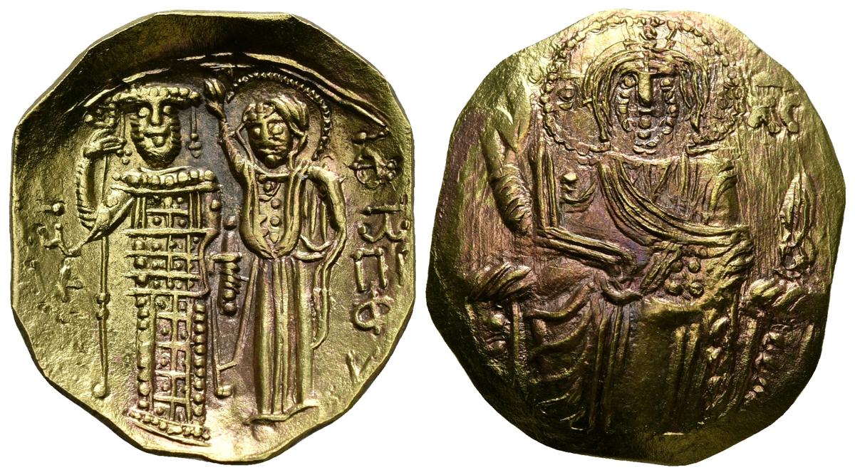 JUAN III DUCAS (Vatatzes). Hyperpyron. 1222-1254 d.C. Magnesia. A/ Cristo en trono de frente, sosteniendo evangelios y levantando la mano derecha. IC-XC. R/ Juan III a izquierda sosteniendo anexikakia y labarum, a la derecha Virgen coronándolo. Sear 2073; LBC 202-8. Electrón. 2,56g. MBC+.