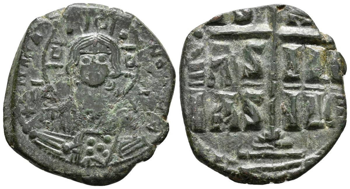 ANONIMO Atribuido a ROMANUS III. Follis. 1028-1034 d.C. Constantinopolis. A/ Busto de Cristo de frente, levantando la mano en bendición y sosteniendo los evangelios. R/ IS XS/BASILE/BASILE alrededor de cruz central sobre grada de tres niveles. Sear 1823. Ae. 9,41g. MBC+.