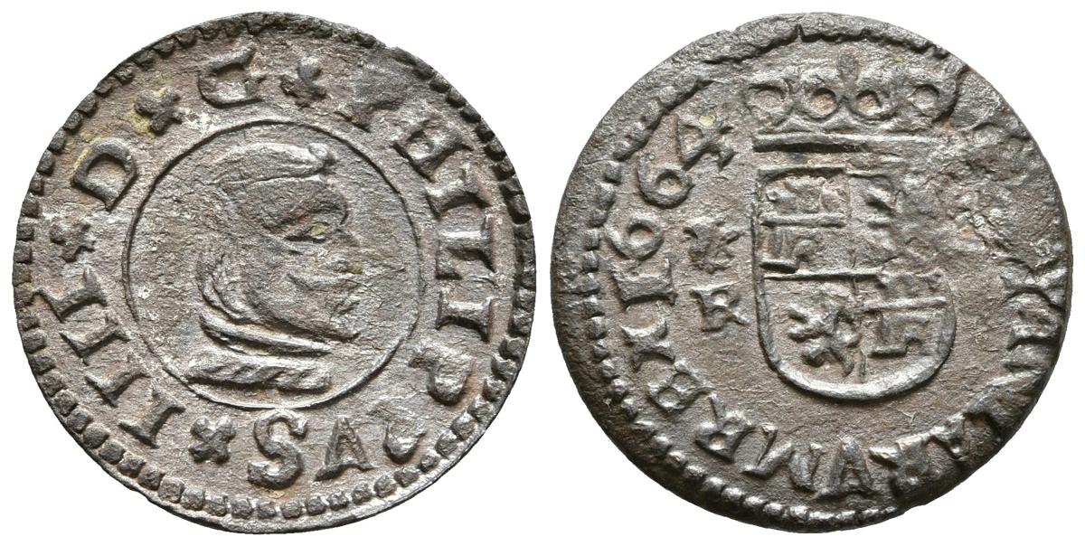 FELIPE IV. 8 Maravedís. 1664. Coruña R. Fallo de acuñación en reverso. Cal-1306; J.S. M-164. Ae. 1,97g. Conserva parte del plateado original. MBC+.