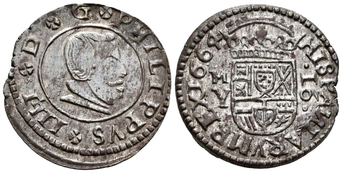 FELIPE IV. 16 Maravedís. 1664. Madrid S. Rectificación sobre el ordinal III(I)I y N de HISPANIARUM invertida. Cal-1406var; J.S. No cita. Ae. 4,34g. Conserva gran parte del plateado original. EBC+. Muy rara.