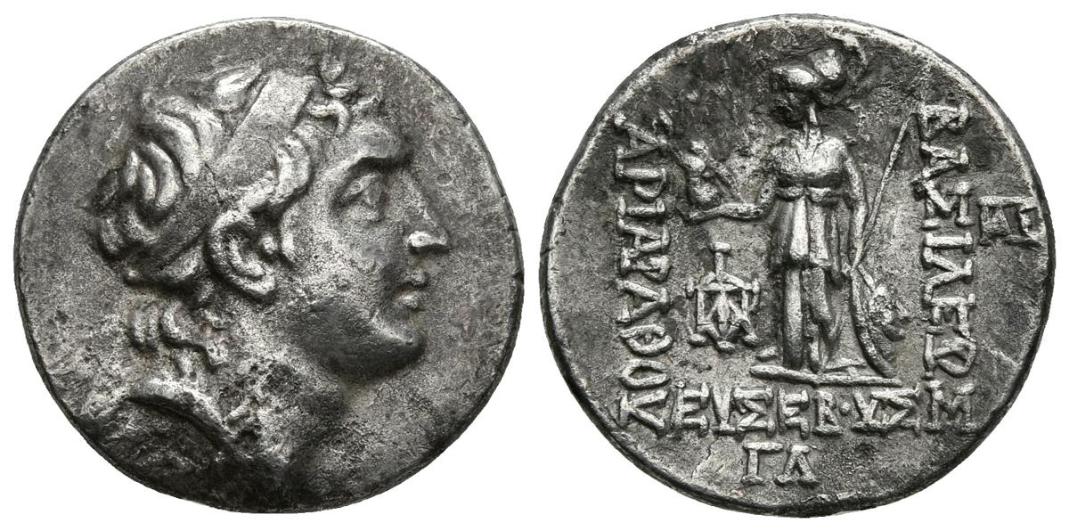 REYES DE CAPPADOCIA. Ariarathes V Eusebes Philopator. Dracma. 163-130 a.C. Eusebeia-Mazaca, Año 33=130. A/ Cabeza con diadema de Ariarathes a derecha. R/ Athena estante a izquierda con lanza y escudo, esta sostiene Victoria. Monograma a la izquierda y a derecha. HGC 811. Simonetta 27 (Ariarathes IV). Ar. 4,10g. MBC+/MBC.