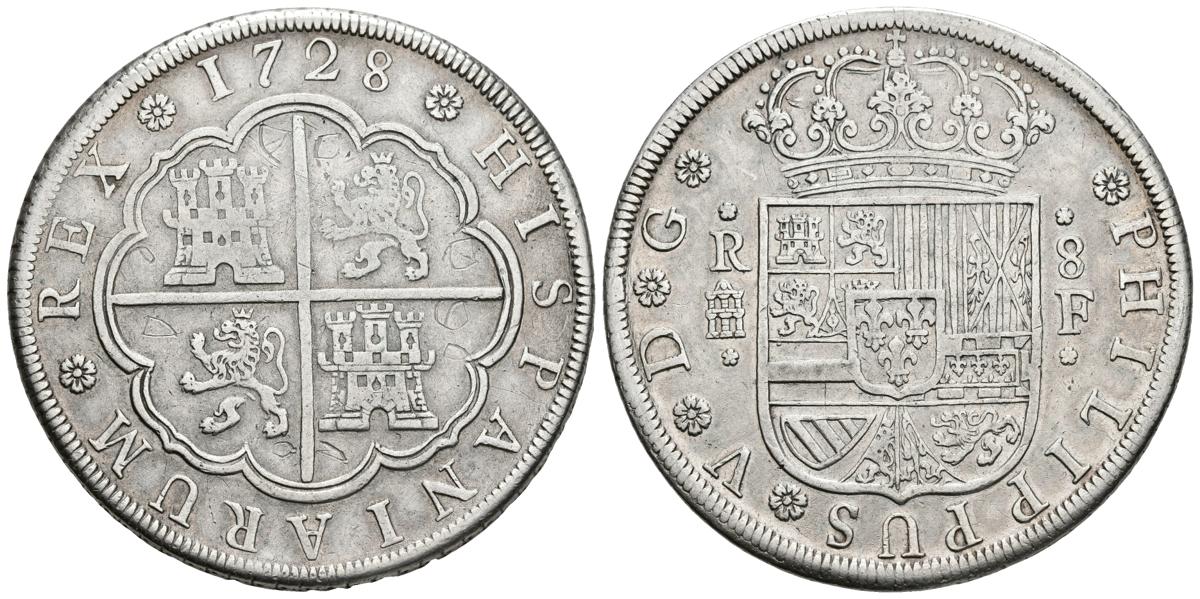 FELIPE V. 8 Reales. 1728. Segovia F. Cal-915. Ar. 26,17g. Graffitis en reverso. MBC+/MBC. Escasa.