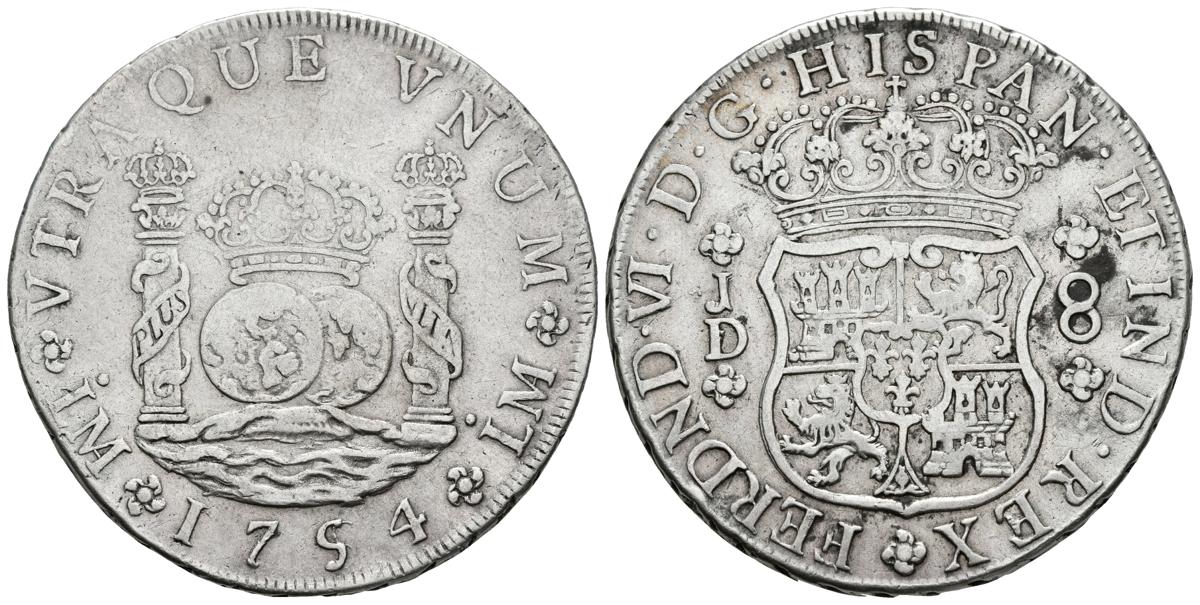 FERNANDO VI. 8 Reales. 1754. Lima JD. Punto sobre las dos LMA. El 5 de la fecha sobre otro 5. Cal-310. Ar. 26,66g. MBC. Muy escasa.