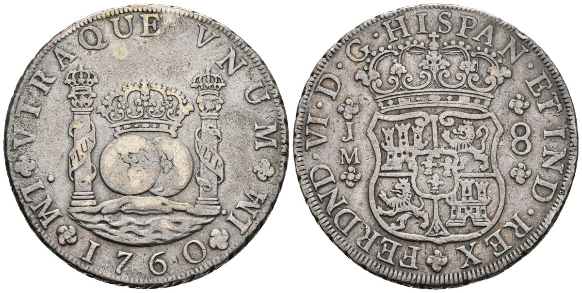FERNANDO VI. 8 Reales. 1760. Lima JM. Punto sobre las dos LMA. Columnario. Cal-320. Ar. 26,11g. MBC-. Escasa.
