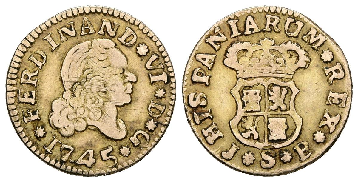 FERNANDO VI. 1/2 Escudo. 1745. Sevilla JP. Falsa de época. Fecha y ensayador correspondiente a Felipe V. Au. 1,78g. MBC-.