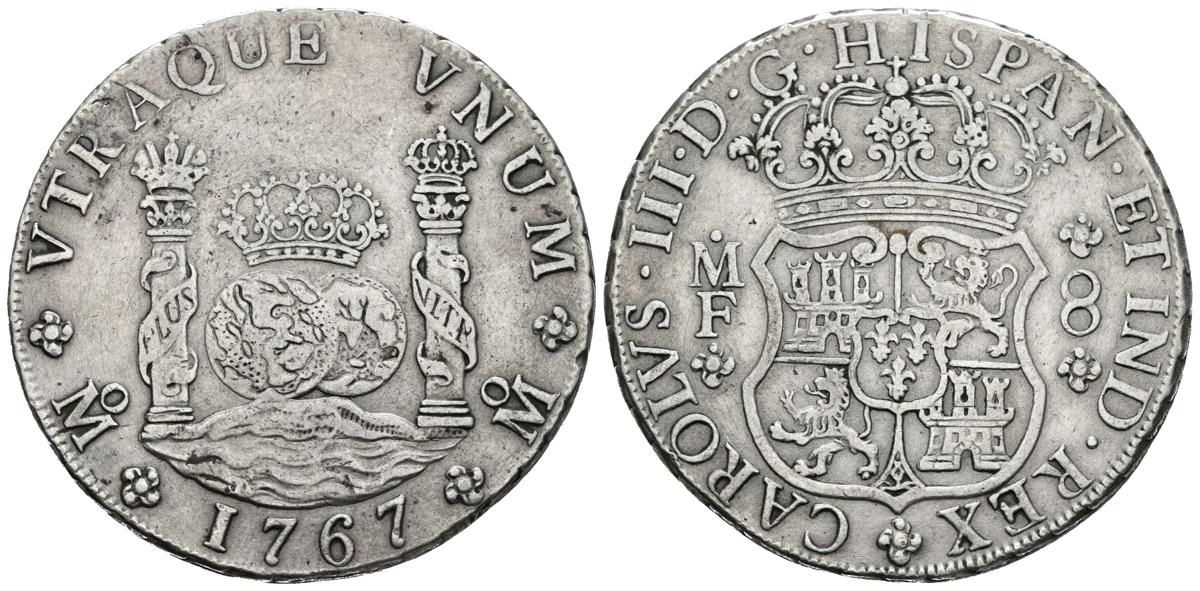 CARLOS III. 8 Reales. 1767. México MF. Columnario. Cal-906. Ar. 26,67g. MBC.