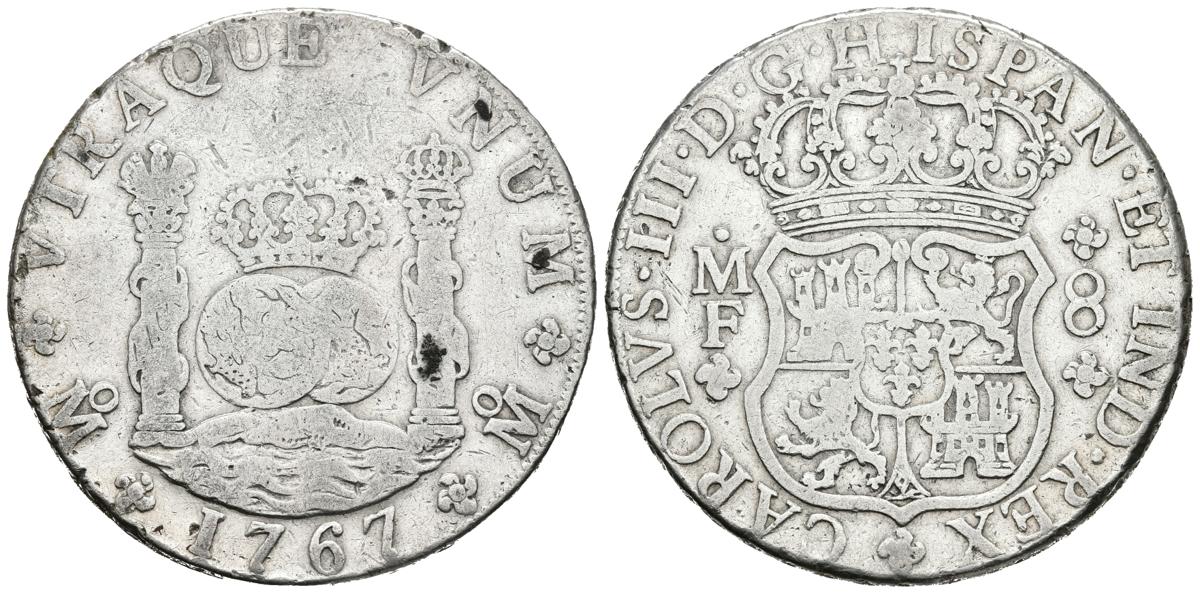 CARLOS III. 8 Reales. 1767. México MF. Columnario. Cal-906. Ar. 26,46g. Estuvo en aro. BC+.