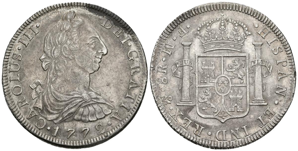 CARLOS III. 8 Reales. 1772. México FM. Ceca y ensayadores invertidos. Cal-916. Ar. 26,98g. Suave pátina con leves restos de brillo original. EBC-/EBC+. Escasa así.
