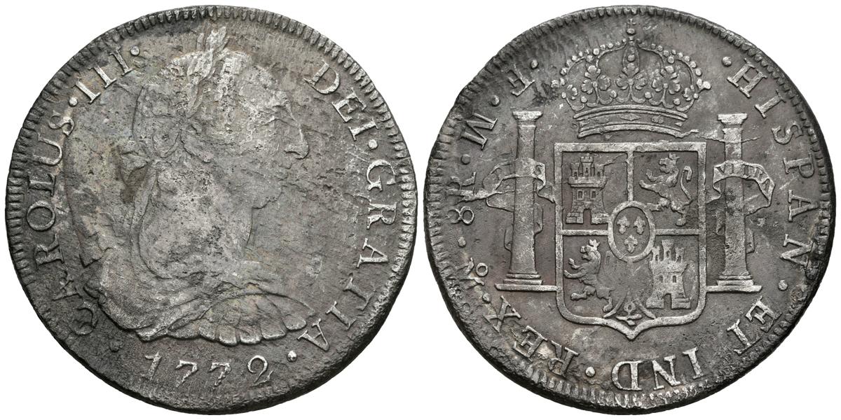 CARLOS III. 8 Reales. 1772. México FM. Primer año de busto. Ceca y ensayadores invertidos. Cal-916. Ar. 24,86g. Oxidaciones marinas. BC/MBC-.