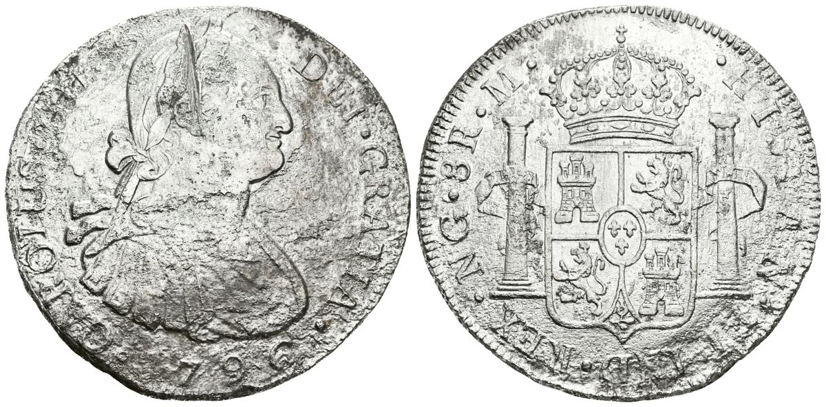 CARLOS IV. 8 Reales. 1796. Guatemala M. Cal-627. Ar. 24,66g. Oxidaciones marinas. BC+. Escasa.
