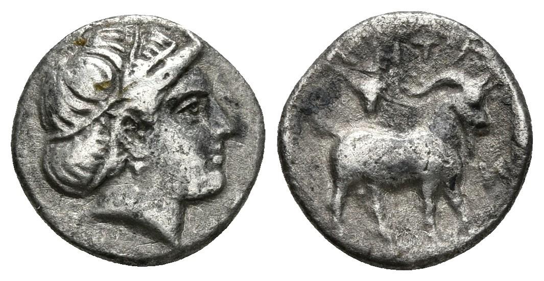 TROAS. Antandros. Obolo. Siglo V a.C. A/ Cabeza de femenina (¿Artemis Astyrene?) a derecha. R/ Cabra marchando a derecha, sobre ella ANTA, delante N invertida. SNG Von Aulock 1492var; Klein 296. Ar. 1,15g. MBC+/MBC-.