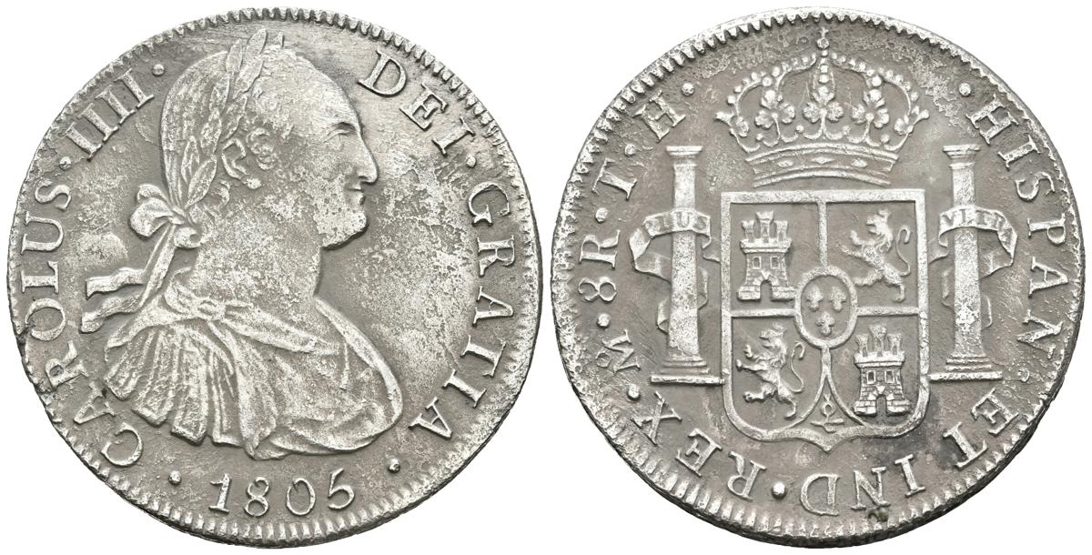 CARLOS IV. 8 Reales. 1805. México TH. Cal-703. Ar. 25,79g. Oxidaciones marinas. MBC-.