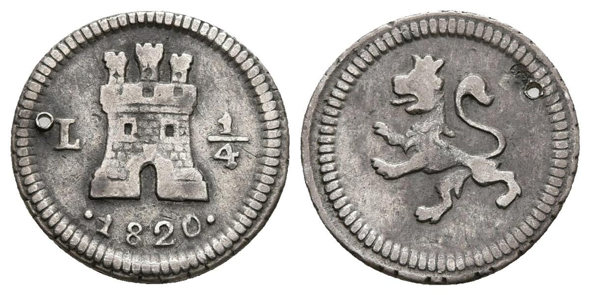 FERNANDO VII. 1/4 Real. 1820. Lima. Cal-1461. Ar. 0,89g. Pequeña perforación. MBC-.